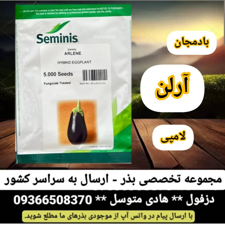 بذر بادمجان آرلن محصول شرکت سمینیس آمریکا بوده که در پاکت های 5000 عددی به بازار عرضه می گردد. بادمجان آرلن جزء ارقام بادمجان لامپی محسوب شده که در سال های اخیر در استان های هرمزگان و فارس مورد کاشت قرار گرفته است.
