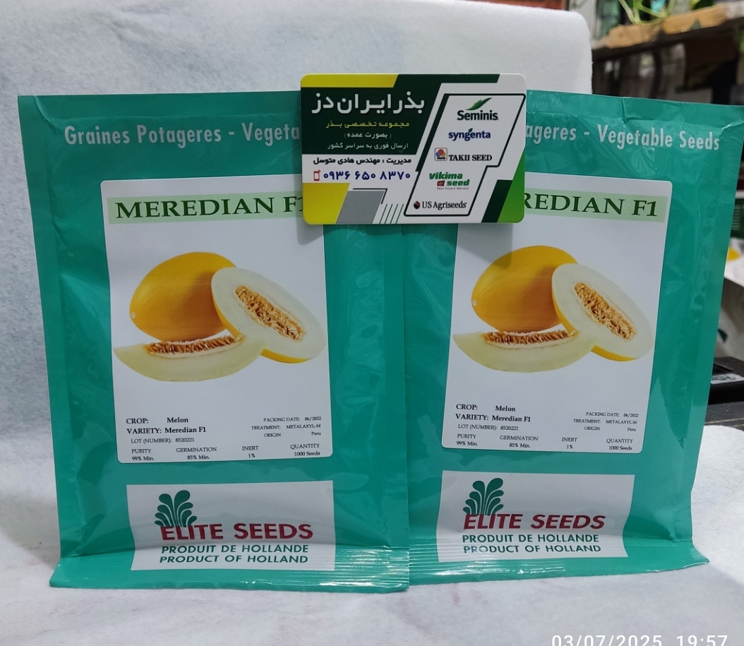 خربزه از نوع "مریدین F1" (Meredian F1 نوع محصول: بذر خربزه از ارقام هیبرید F1 مشخصات بذر: خلوص 99% و حداقل جوانه زنی 85%. تاریخ بستهبندی: ژوئن 2022. منشأ: محصول هلند. مقدار: حاوی 1000 عدد بذر.