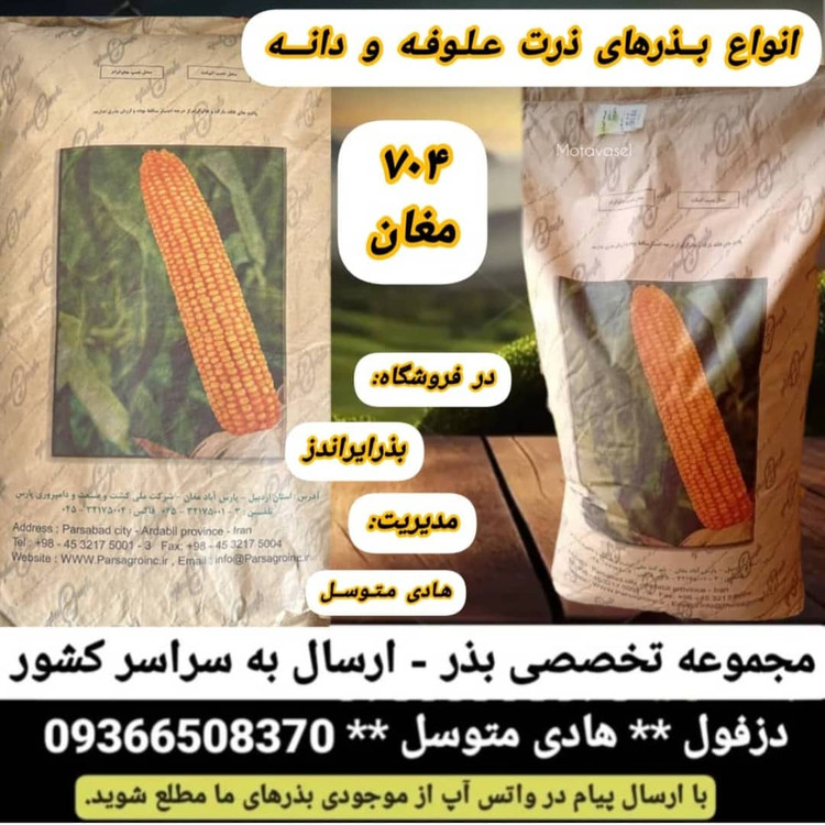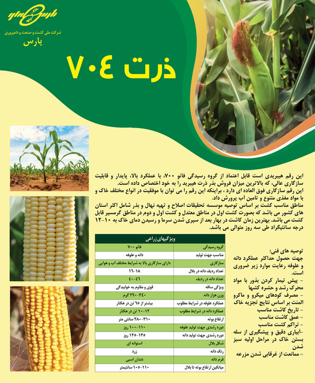بذر ذرت 704 مغان محصول شرکت کشت و صنعت دامپروی پارس از بهترین و پر بار ترین بذر ذرت علوفه ای می باشد. بذر ذرت 704 مغان رقمی دو منظوره بوده و در بسته بندی پاکت 25 کیلویی به فروش می رسد.