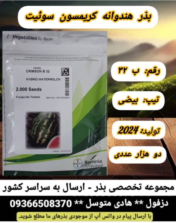 با توجه به نوسانات چند ساله قیمت ارز در بازار و تغییر قیمت بذور جهت استعلام قیمت با ما در ارتباط باشید. جهت خرید بذر هندوانه بی 32 (b32) می توانید فرم ثبت سفارش را تکمیل نمایید و یا با کارشناسان ما در ارتباط باشید.